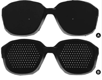 Kính Lỗ (Pinhole): Phần lớn diện tích kính là màu đen, chỉ có một lỗ nhỏ ở trung tâm. Người đeo buộc phải nhìn xuyên qua lỗ này.